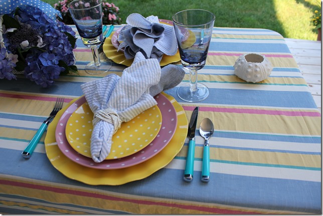 I decided at the last minute to try out a table using fabric I bought to make tablecloths for a Covered Dish Supper our beach community is having on the 27th.